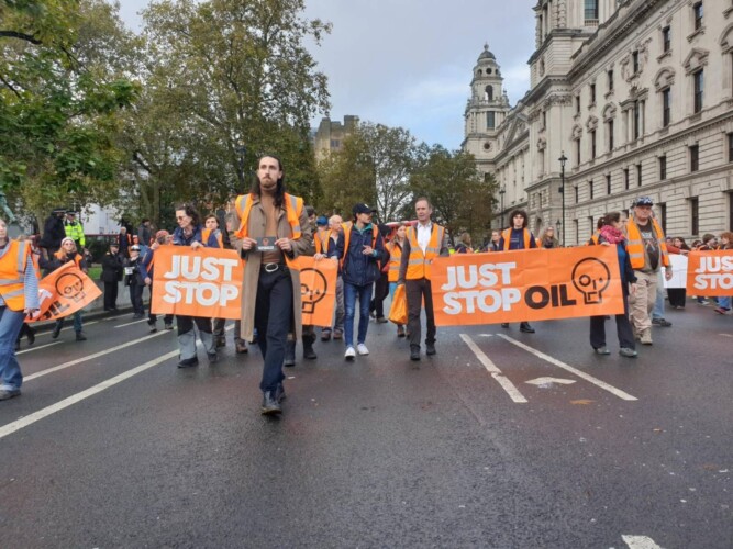 At around 10am, 65 Just Stop Oil protestors began marching around Parliament Square, Westminster, to demand the government to stop new oil, gas and coal projects in the UK.