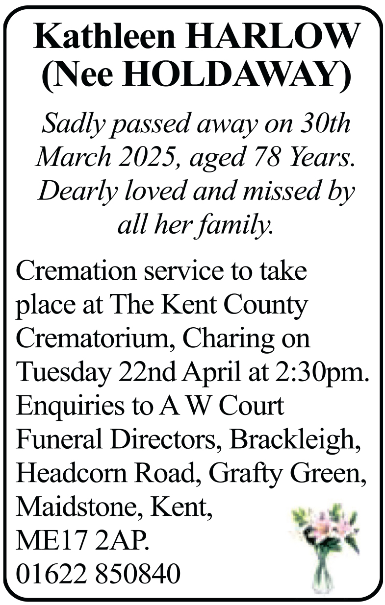 Announcements Kathleen Harlow (Nee Holdaway) 17 April 2025 News Reporter Share this storyTweet Click to share on WhatsApp (Opens in new window) WhatsApp Related stories