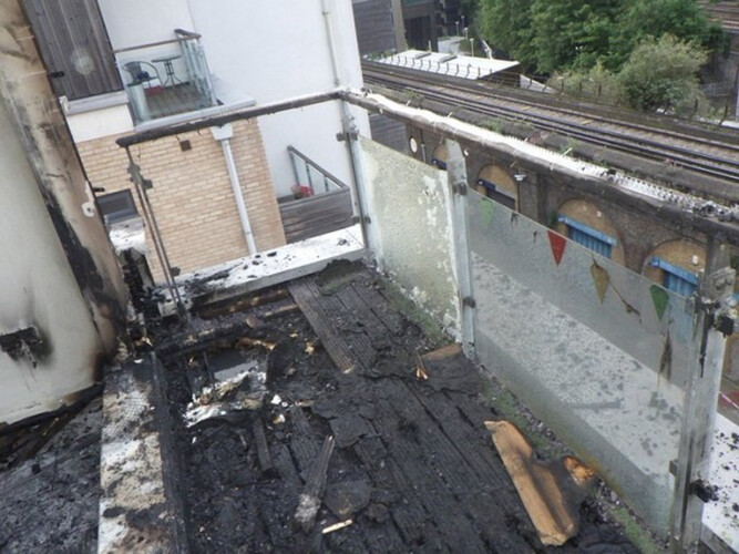 Balcony damaged by fire on Childers Street, Deptford