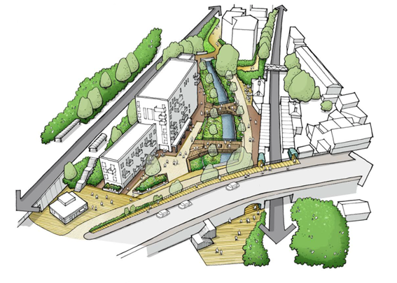 ● Two broad river decks creating a pleasant place to pause and meet outside the stations with new planting and seating.