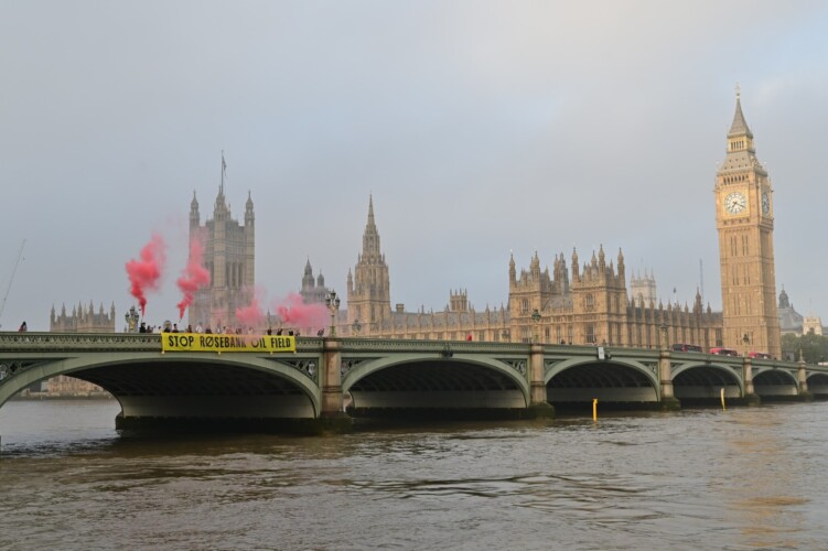 Protesters unravelled a 15-metre “Stop Rosebank Oil Field” banner in the heart of London yesterday morning to protest Prime Minister Rishi Sunak’s decision to grant new fossil fuel licences in the North Sea.