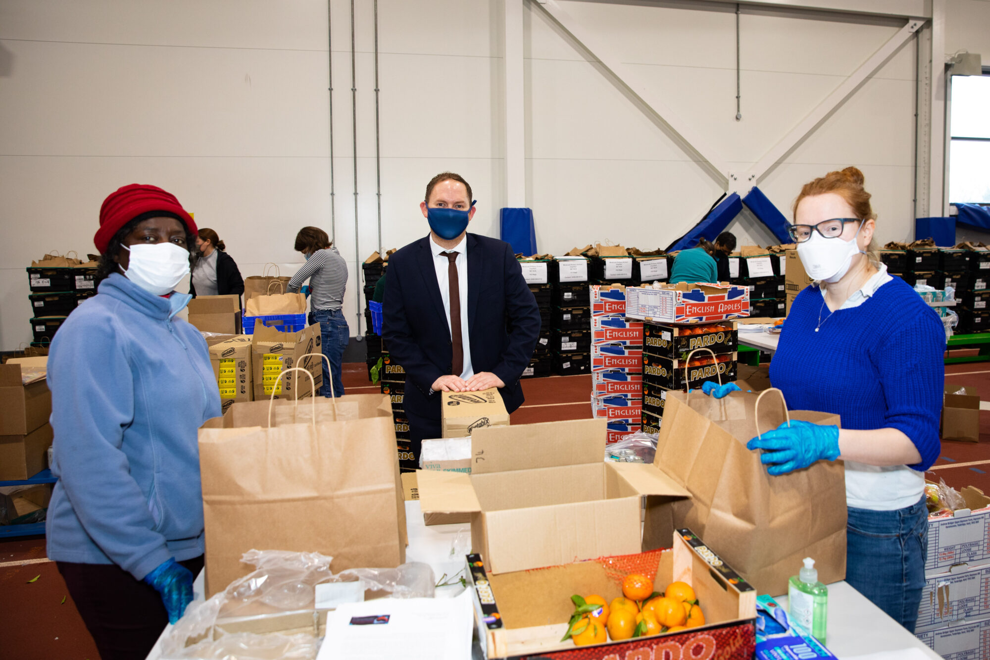 Pictured top: Cllr Danny Thorpe packing food bags at the Sutcliffe Park Leisure Centre.