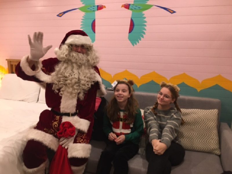 We received a welcome glass of Prosecco – juices for the kids – in our lovely little lodge, equipped with an en-suite bathroom, before we were visited by Father Christmas himself, who brought the girls a gift and chatted away as they looked on in wonder.