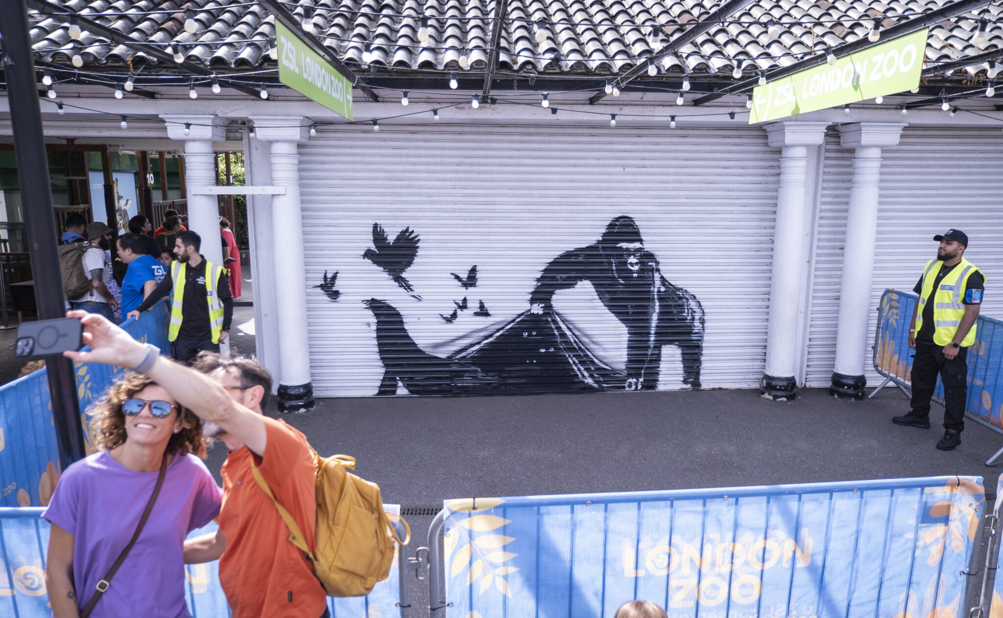 Visitors to London Zoo were treated to a surprise new addition yesterday morning after Banksy’s latest artwork appeared on the zoo’s main entrance gates overnight.