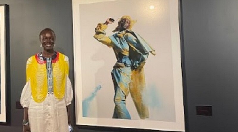 Picture: Ayuol Manyok with the picture she models in at the opening of the exhibition