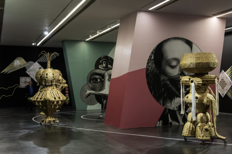 In her series of collages, Mesmerizing Mesh, the artwork references sacred and ritualistic paper objects related to shamanism and folk or pagan traditions, while The Intermediates, features hybrid ‘creature-like’ sculptures made from artificial straw that draws from global weaving techniques.