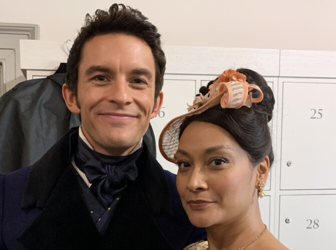 Pictured top: Jonathan Bailey and Theresa Godly on the set of Bridgerton (Picture: Theresa Godly)