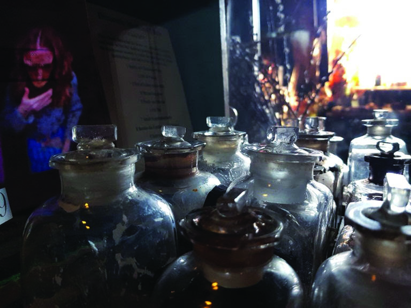 Taking inspiration from the unusual and sometimes creepy artefacts and antidotes from the museum’s collection, pieces in the exhibition include an eerie projection of a woman in a mask, and rows of lockdown representations in medical bottles.
