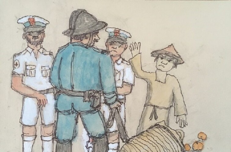 Sid and I were walking towards a cafe with tables outside when we came upon a French gendarme who, baton in hand, had kicked a young woman’s basket off the pavement sending scores of oranges rolling over the road.
