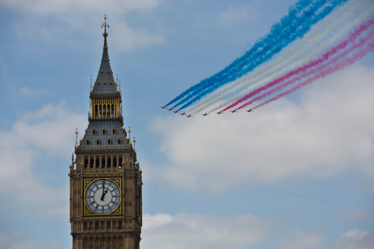 Pictured top: Red Arrows fly-past marks the 70th anniversary of VE Day in 2015 (Picture: Jeff Gilbert / Alamy Stock Photo)