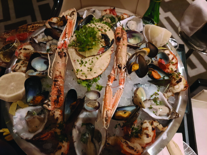 The seafood platter arrived at our table carried by two waiters and included king prawn, langoustine, crab, oysters, mussels and clams.