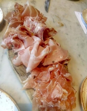 Three dishes per person were recommended. Aware that lunch needed to be a speedy affair, we began with a selection of cured meats (£14.75) – Parma ham and three other kinds of ham, including a rather moreish mortadella, delicately studded with pistachios.