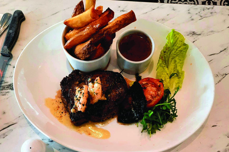 My husband had tunnel vision for surf and turf – rib-eye steak, resplendent with garlic king prawns and served with Bernaise sauce.