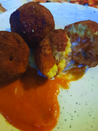 Starters included olives, served with three hunks of home-made sourdough, oil and vinegar, calamari and zucchini fritti, as well as arancini of the day – tomato and mozzarella.