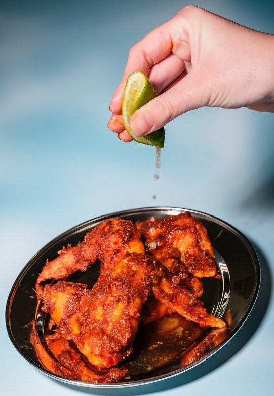 The M Wing, an addictively brined, and deep-fried chicken wing tossed in an anchovy sambal and served with lime; Black Pepper Chicken Curry; Assam Pedas, a typical Malay sour fish curry with okra, aubergine, sour tamarind and a fiery spice mix of chilli, belacan, lemongrass and galangal.