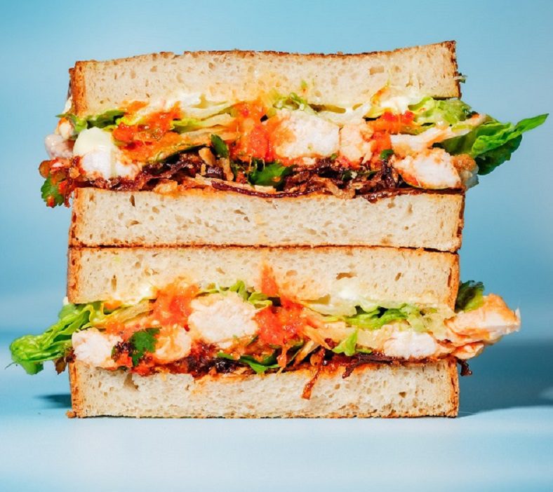 Kerabu Pork Belly, cured and grilled and served alongside crunchy fresh cucumber, tomatoes, shallots, laksa leaf, mint, pounded dried shrimp and sambal belacan and Hainanese Chicken Sando, poached and shredded chicken breast tossed in ginger & spring onion oil, kewpie mayo, chicken fat chilli vinegar, crispy fried onions and fresh cucumber.