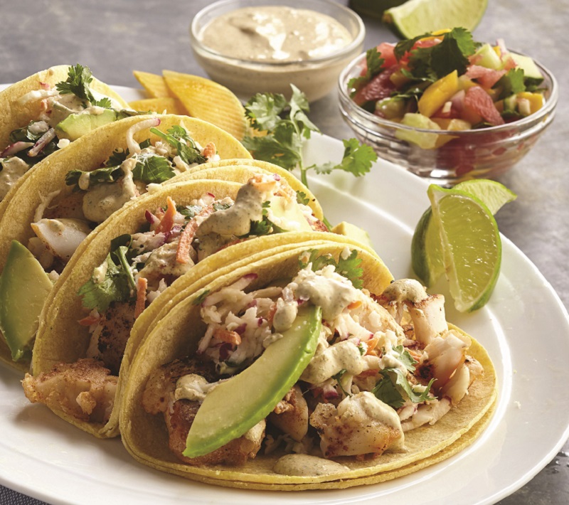 Recipe: Fish Tacos, Poblona Sauce, Slaw and Watermelon Salad