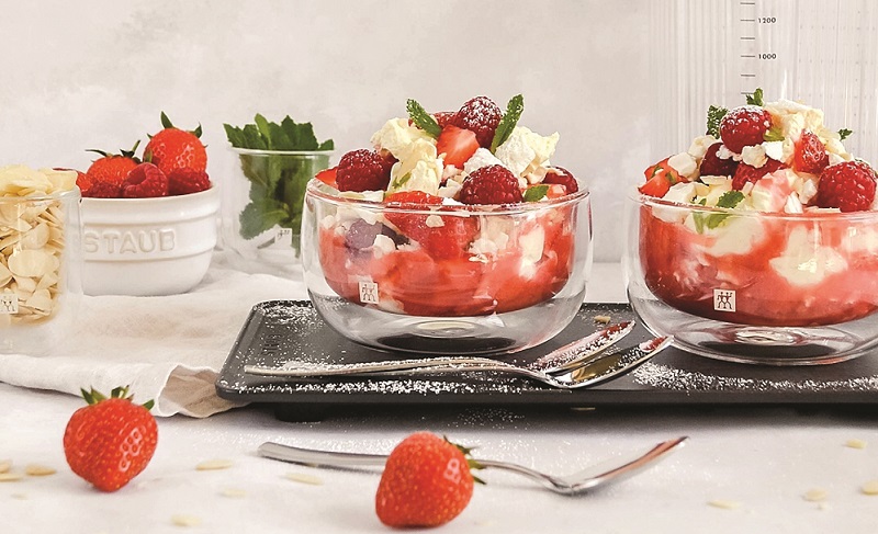 4. In a serving bowl use your hands to crumble the meringues and add the cream, raspberries and strawberries.