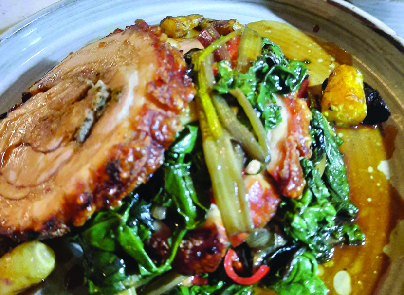Sunday roast was trialled on Father’s Day but executed with Italian panache – Dingley Dell slow roasted pochetta, served with sautéed rainbow chard, garlic and lemon, herb roasted potatoes with beef dripping, carrots, apple sauce, and lashings of black garlic and wine jus.