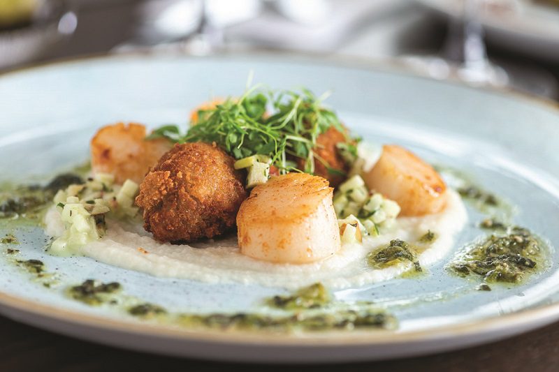 Pan-fried wild scallops, cooked in ras el hanout and served with smoked haddock Florentine bonbons, celeriac puree, apple and fennel tartare worked surprisingly well.