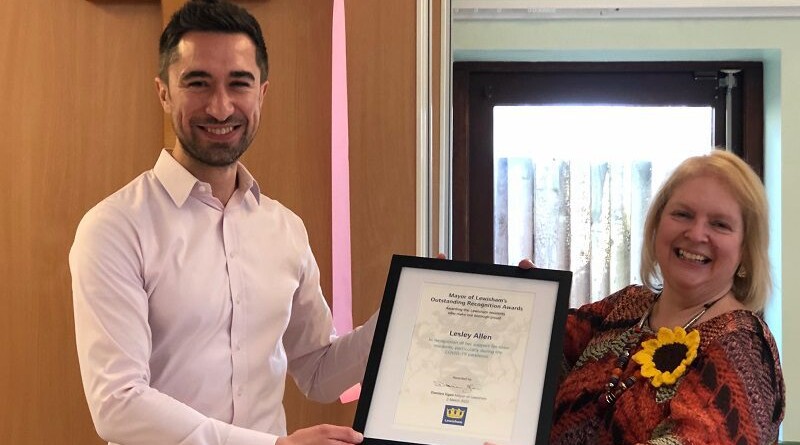 Lesley Allen, founder of the Diamond Club and Bring Me Sunshine, has been presented with a Mayor of Lewisham’s Outstanding Recognition Award in recognition of her tireless work to support older residents during lockdown.