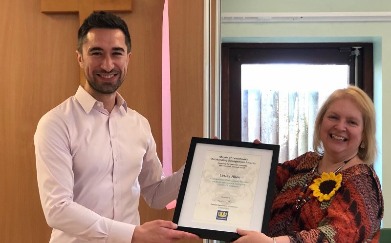Lesley Allen, founder of the Diamond Club and Bring Me Sunshine, has been presented with a Mayor of Lewisham’s Outstanding Recognition Award in recognition of her tireless work to support older residents during lockdown.