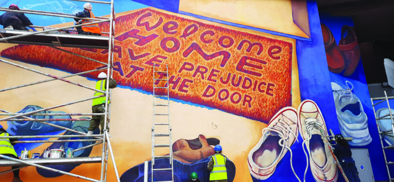 The mural depicts shoes and a welcome mat with the words leave your prejudice at the door on it.