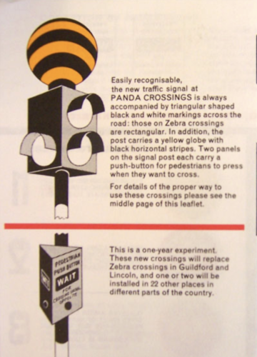 The new style of pedestrian crossings were called Panda Crossings. They were introduced by the Minister of Transport, Ernest Marples, as a first attempt to replace the zebra crossing – which had been launched in the 1950s.