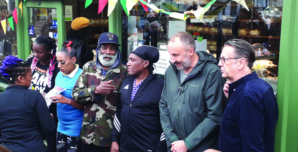 Main Pic: Dennis Bovell, centre, outside the Mixed Blessings bakery where TMC Studios once was, ahead of the unveiling of the Blue Plaque