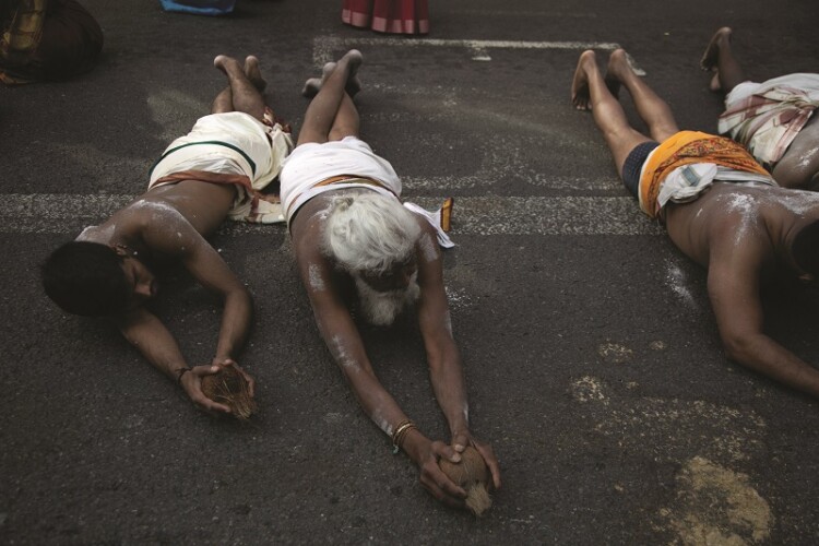 “A line of men rolled on the ground towards the larger chariot as it moved, holding a coconut in their hands as a form of devotion.
