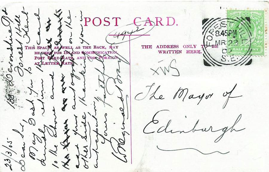 A few weeks ago, I purchased a heraldic postcard addressed to The Mayor of Edinburgh in March 1905, by the notorious autograph hunter W. Reginald Bray, of 135 Devonshire Road, Forest Hill.