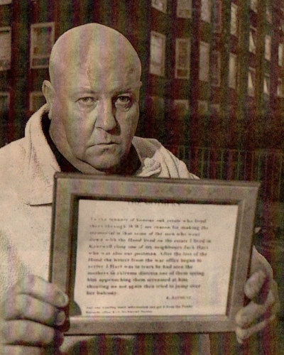 The document – signed by R. Rayment – tells the story of what happened when a postman, Jack Heart, delivered letters to Kentwell Close on the Honor Oak Estate, shortly after HMS Hood was sunk during the Second World War.