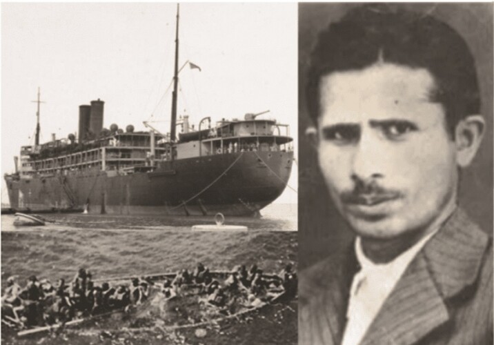 Picture: S.S. Tilawa, Kash Kumar’s late grandfather who drowned, Nichhabhai Chibabhai Solanki and survivors in a lifeboat. Picture: Tilawa 1942