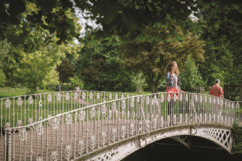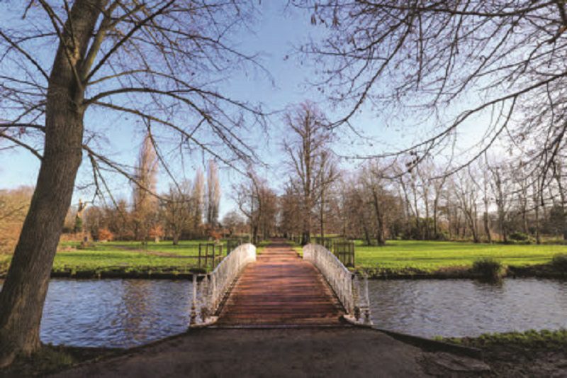 Visitor stood on the white bridge over the River Wandle at Morden Hall Park, London