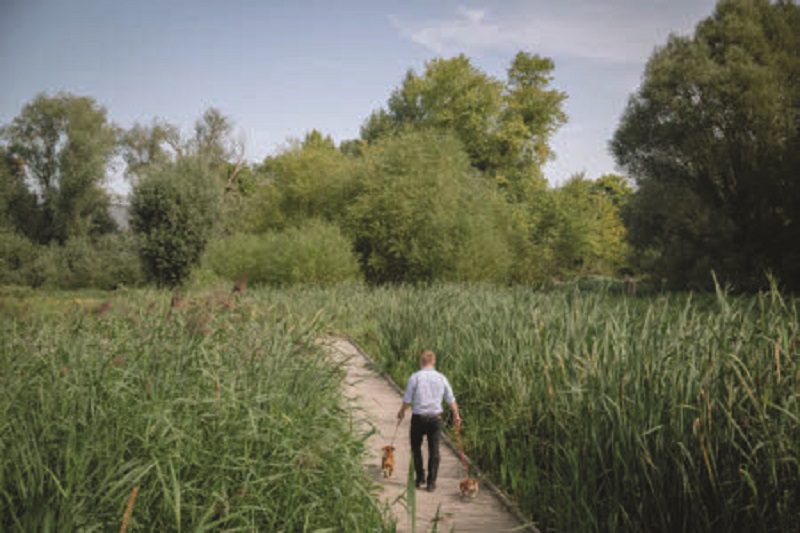 A visitor walking with dogs along the new boardwalk giving access to wetlands area at Morden Hall Park, London
