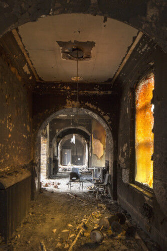 The surface of the walls reveals some of the 125-year history of the Victorian hall, which suffered the worst damage in the fire. The cleanup operation revealed successive generations of paintwork, brickwork and ironwork including a renovation of the grand hall balcony in the 1930s.