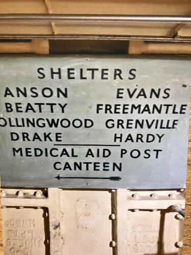 Direction sign to individual shelter areas at Clapham South – named after 16 British naval commanders (Picture: Ronan Thomas)