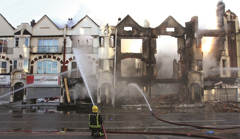 Six fire engines and 30 firefighters were called to the shoe shop after looters torched it.