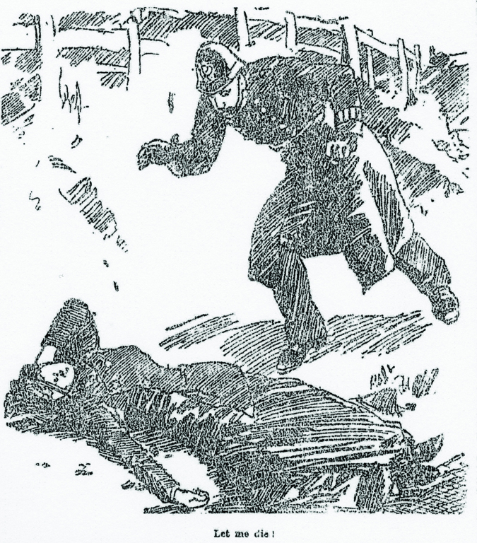 When she raised her left hand and asked him to take hold of it, he was appalled to see that her brain protruded through one of the terrible wounds.