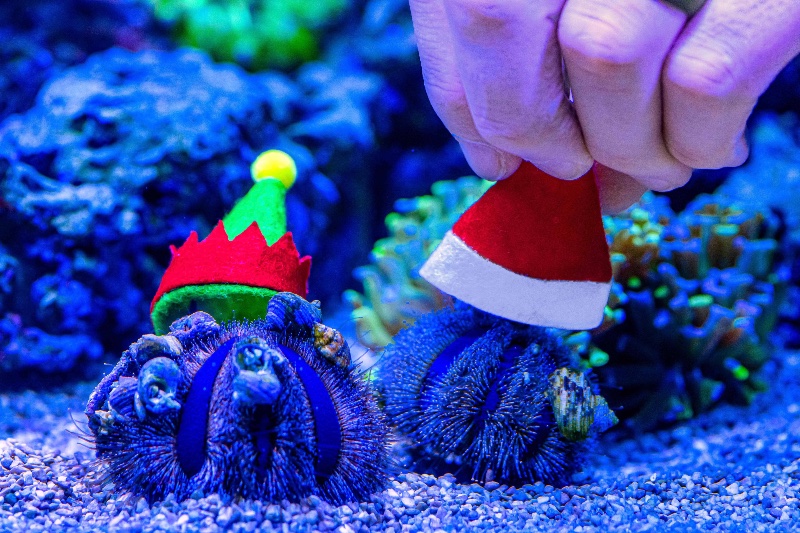 Some of the Aquarium’s smallest residents, the sea urchins, donned equally tiny Santa and elf hats with the help of a specially trained diver.