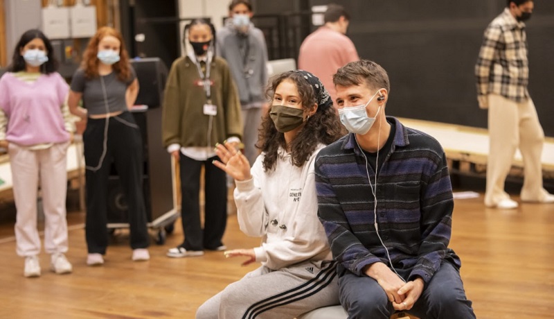 Sarita Gabony (Mia), Joe Bolland (Lucas) and company in rehearsal for Our Generation at the National Theatre. Photo by Johan Persson