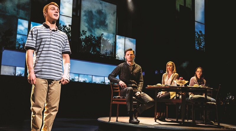 Pictured: Sam Tutty as Evan Hansen, Rupert Young as Larry Murphy, Lauren Ward as Cynthia Murphy, Lucy Anderson as Zoe Murphy – Picture: Matthew Murphy