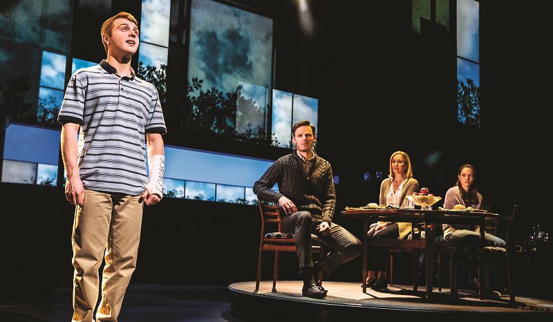 Pictured: Sam Tutty as Evan Hansen, Rupert Young as Larry Murphy, Lauren Ward as Cynthia Murphy, Lucy Anderson as Zoe Murphy – Picture: Matthew Murphy