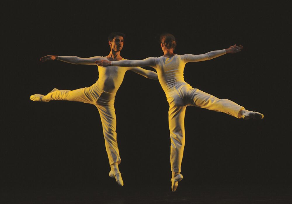 In white costumes that recall the 1970s, the dancers move across the stage in pairs, disappearing into the wings just in time for another pair to appear.