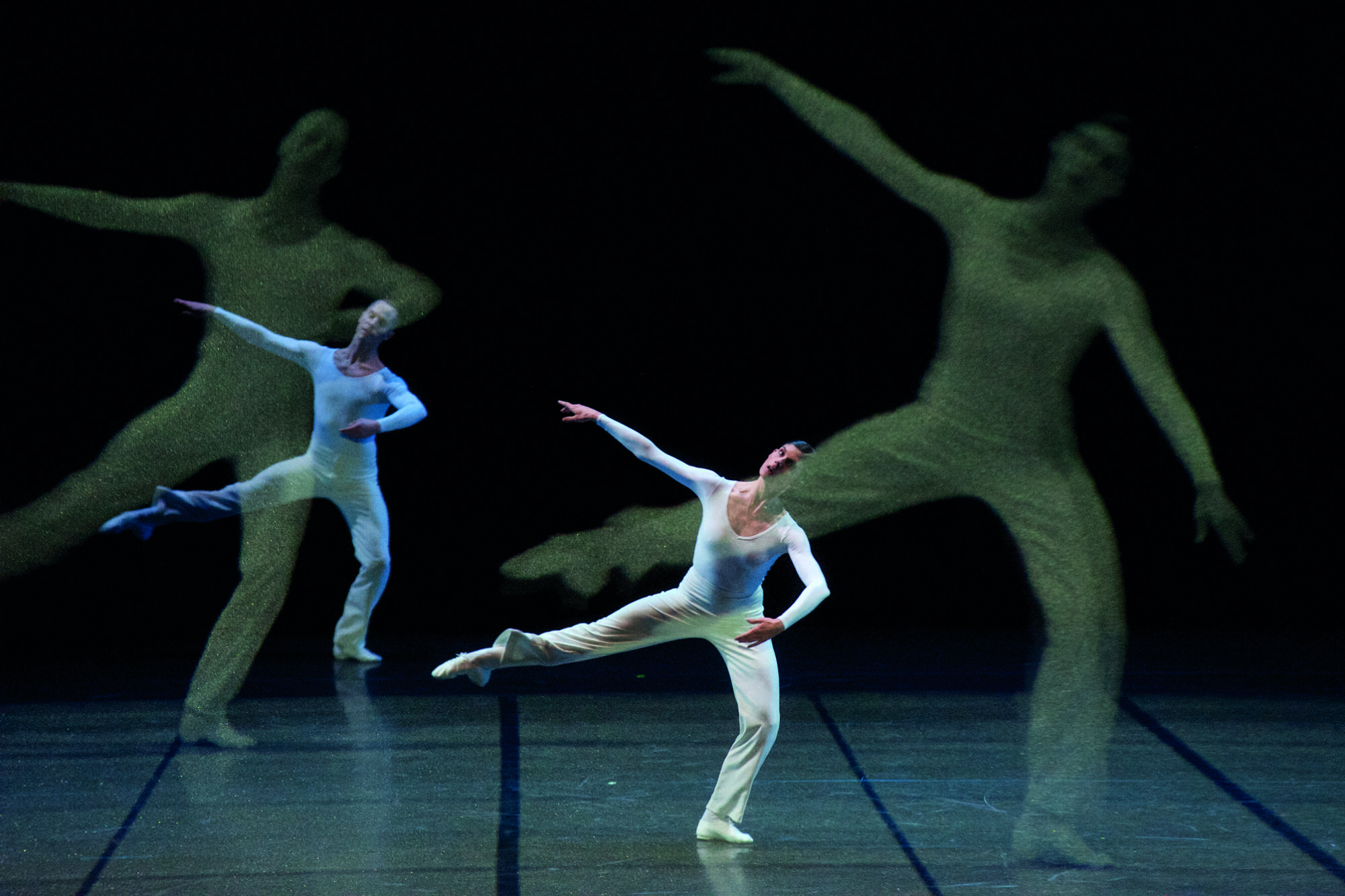 In white costumes that recall the 1970s, the dancers move across the stage in pairs, disappearing into the wings just in time for another pair to appear.