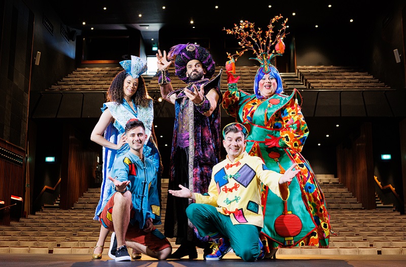 Picture: Back row, from left, Kiera-Nicole as Jasmine, Davood Ghadami, Abanazer, and Richard J Hunt, Widow Twankey, Front, from left, Kian Zomorodian as Aladdin and Charlie Guest as Wishee Washee Picture: Jack Dryden