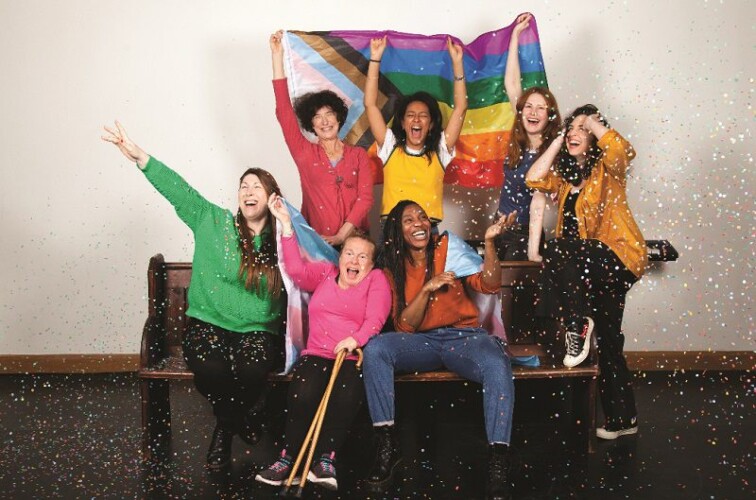 For more information - https://sohotheatre.com/shows/the-ministry-of-lesbian-affairs/ Pictured: Back row standing: Shuna Snow, Fanta Barrie, Claudia Jolly, Lara Sawalha. Sitting: Mariah Louca, Freddie Stabb, Kibong Tanji
