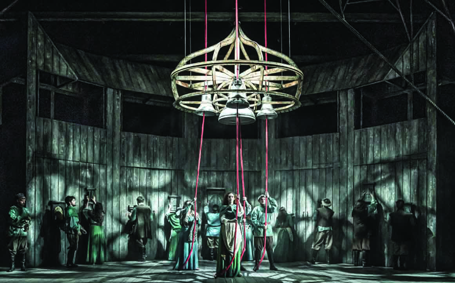 Francis O’Connor’s design is simple but functional. An oversized chandelier with church bells suggests the religious conflicts present in the piece. While a large two-tiered wooden structure gives support to the wonderful ensemble pieces characteristic of Russian opera.