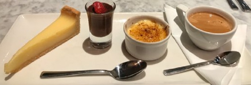 Finally, Desserts – A Cafe Gourmand – a selection of three classic French mini-desserts: crème brûlée, mousse au chocolat and tarte au citron served with a latte (changed from an espresso). Also, a classic Sorbet – two scoops of lemon or mango. All quite small portions as described, but refreshingly light and moreish. Desserts average around £7 each.