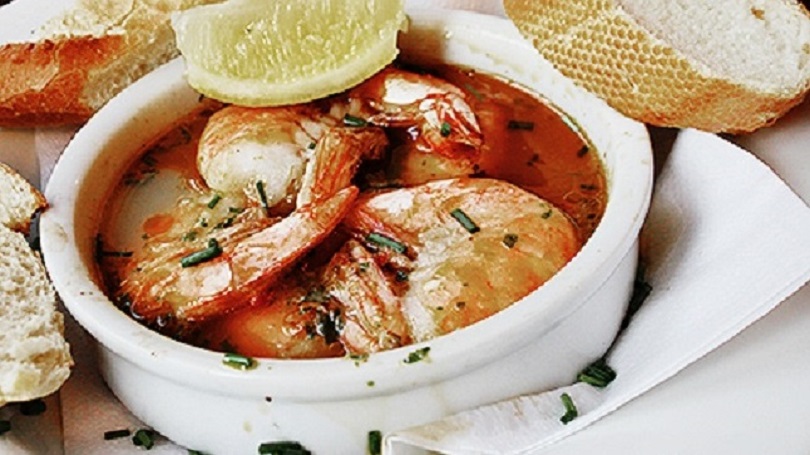 For starters – Crevettes – large king prawns in garlic & smoked chilli butter with a small sliced baguette for £7.50, accompanied with a bowl of lemon water for a finger-washing dip as the prawns still have some shell intact.
